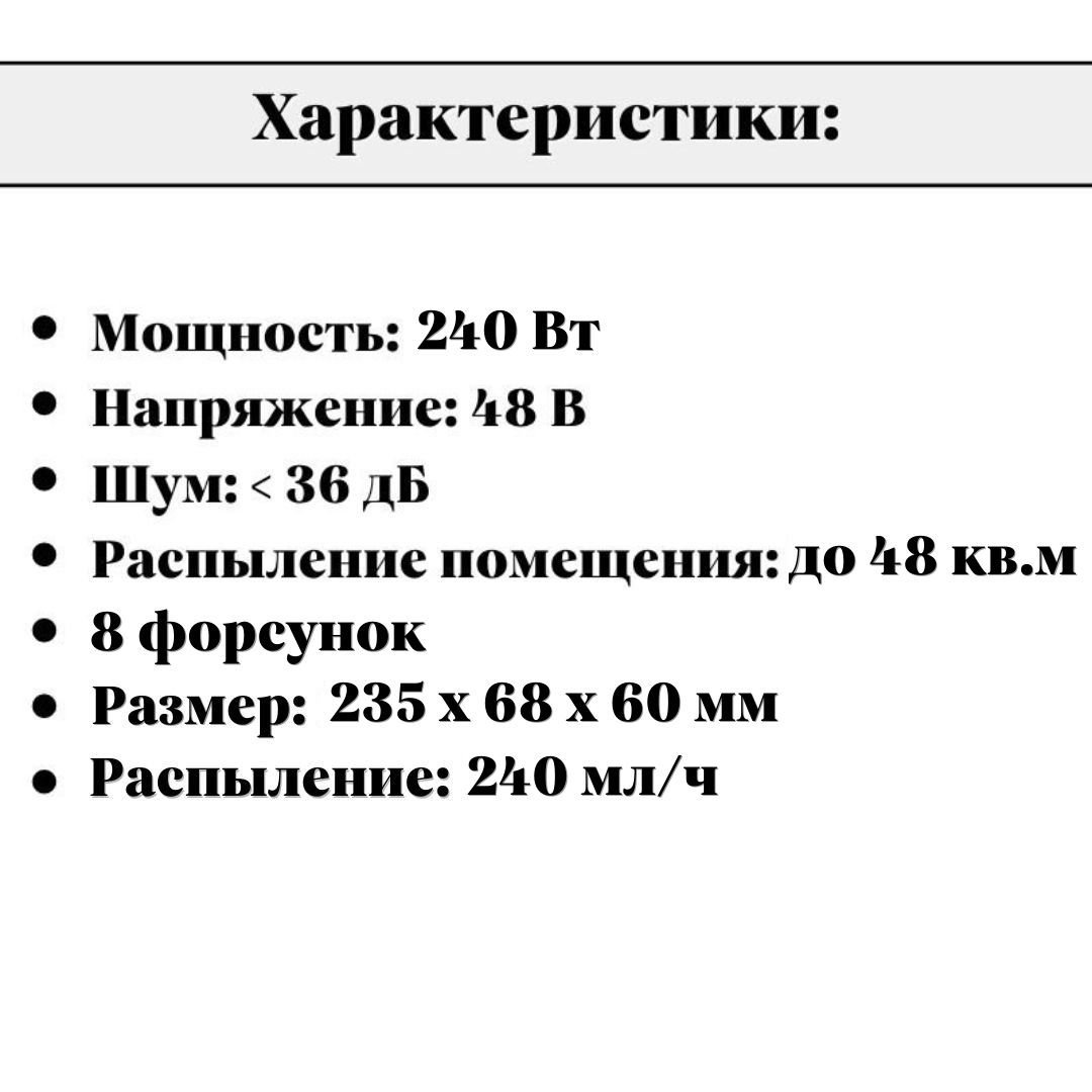 Важно отметить, что для работы увлажнителя рекомендуется использовать дистиллированную или отфильтрованную воду. Трансформатор на 48В приобретается отдельно.