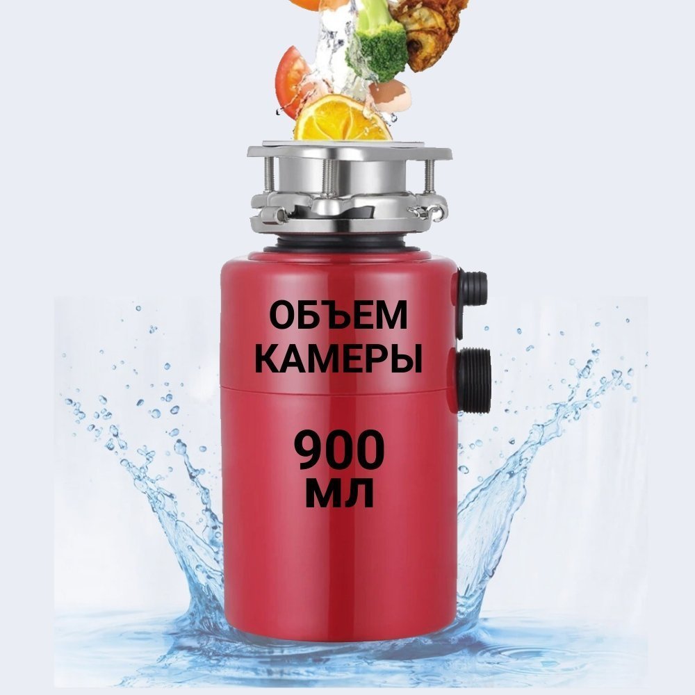 Объём камеры составляет 900 мл, что является оптимальным размером для большинства кухонь. Это позволяет измельчать достаточное количество отходов за один раз, не перегружая устройство.