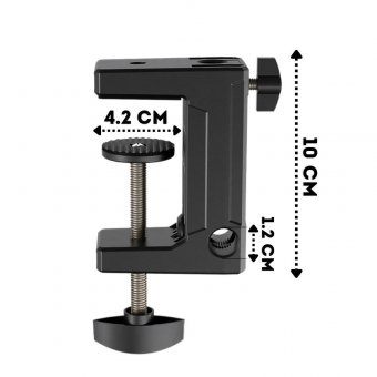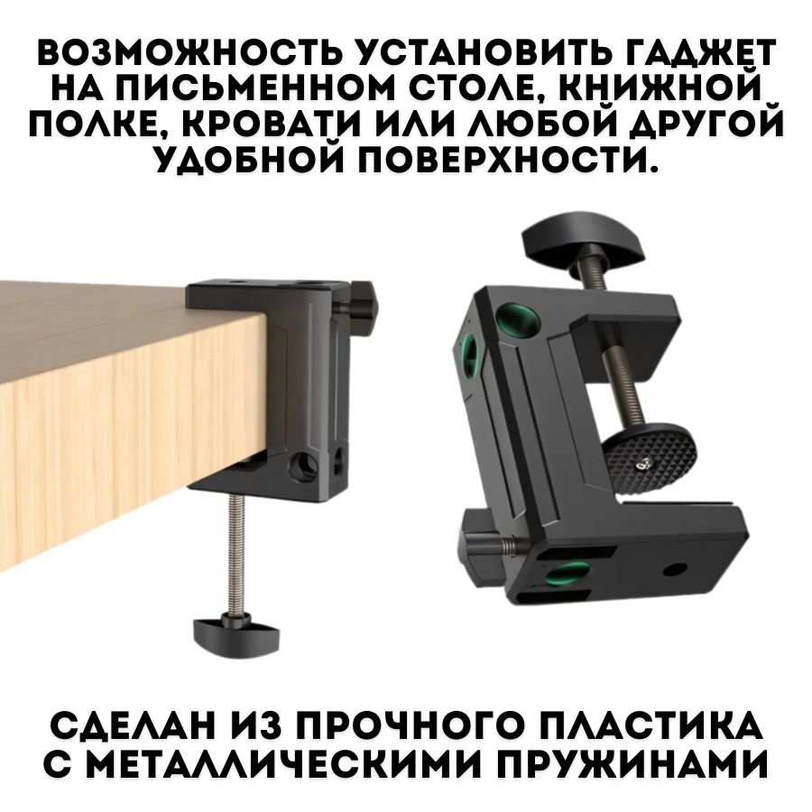 - Регулируемая длина подставки и кронштейна. Это даёт возможность установить гаджет на любой поверхности, будь то письменный стол, книжная полка, кровать или любая другая удобная поверхность. Вы сможете настроить угол наклона по своему желанию и освободить место на рабочем столе.