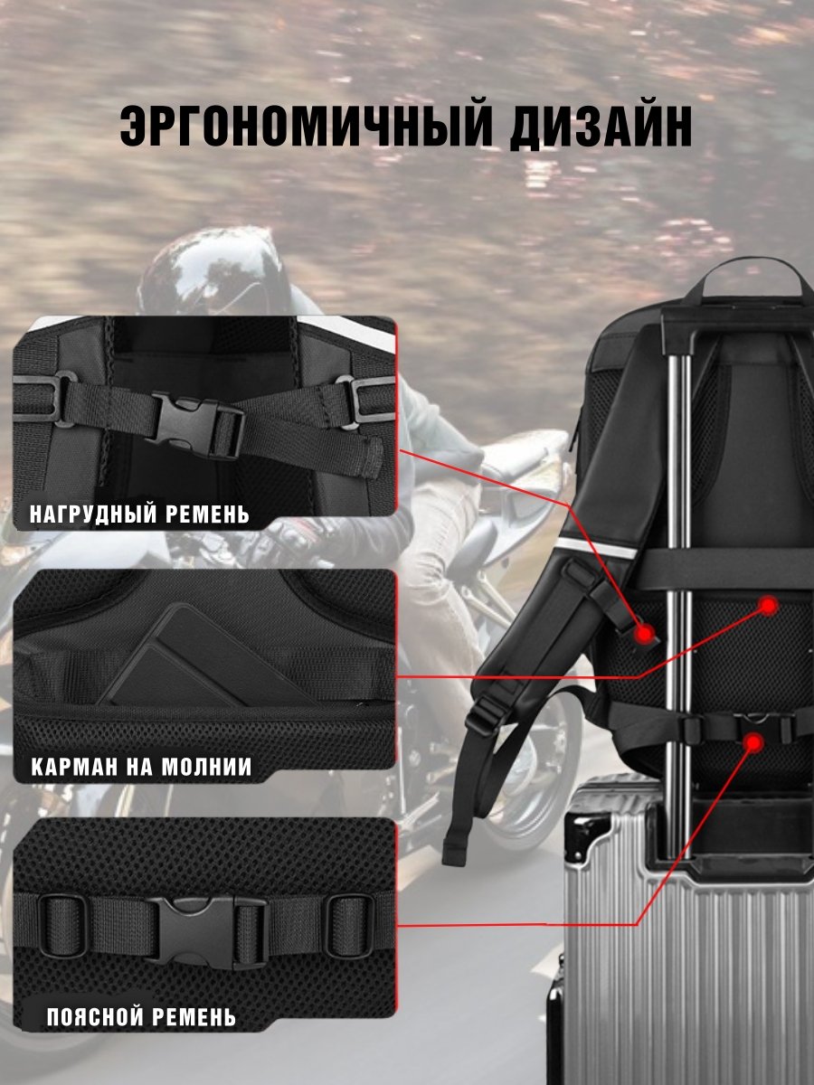 - Что поместится: шлем, ноутбук до 15.6", экипировка, документы, гаджеты и не только.