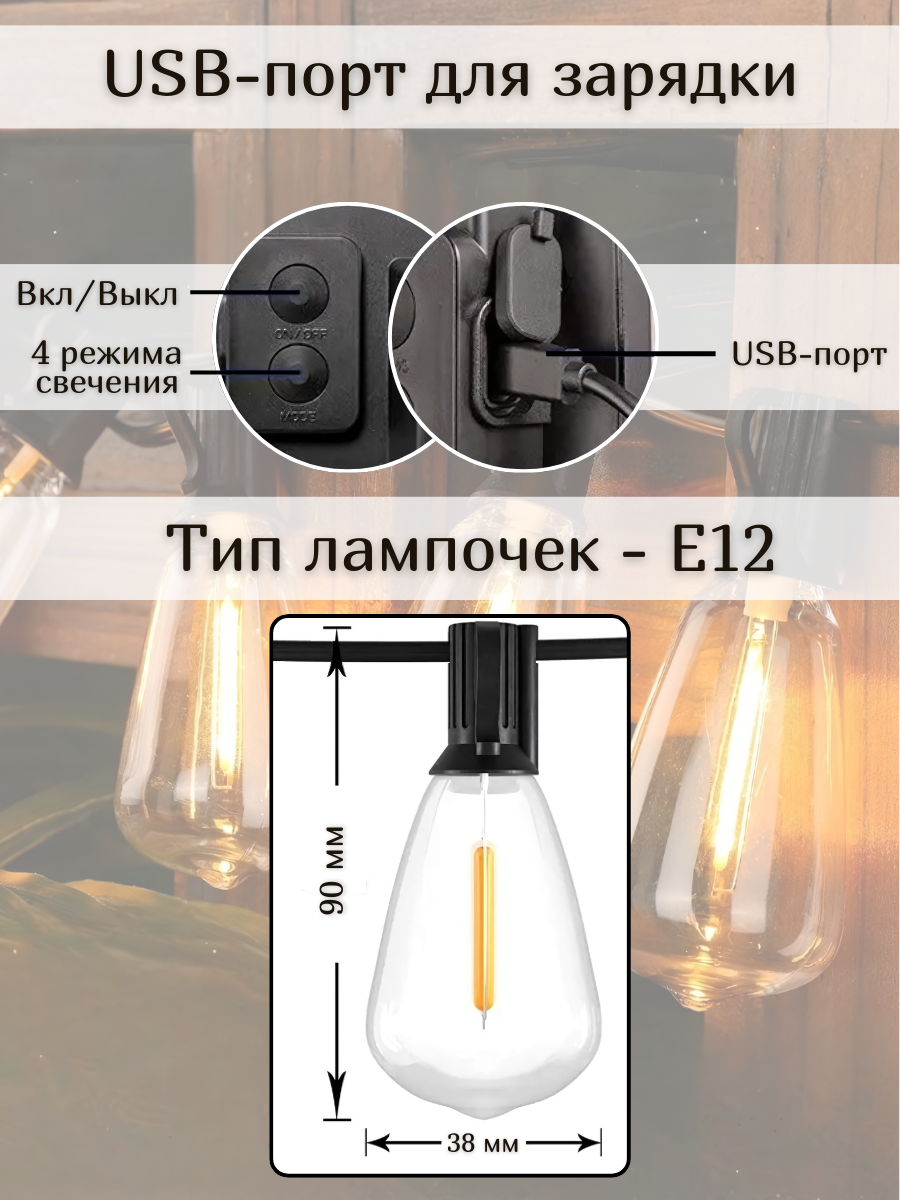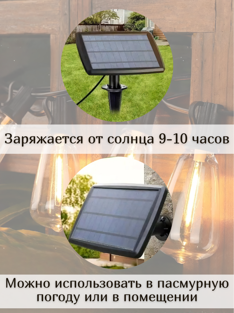 - Гирлянда работает от солнечной энергии. Так же есть USB-порт для зарядки.