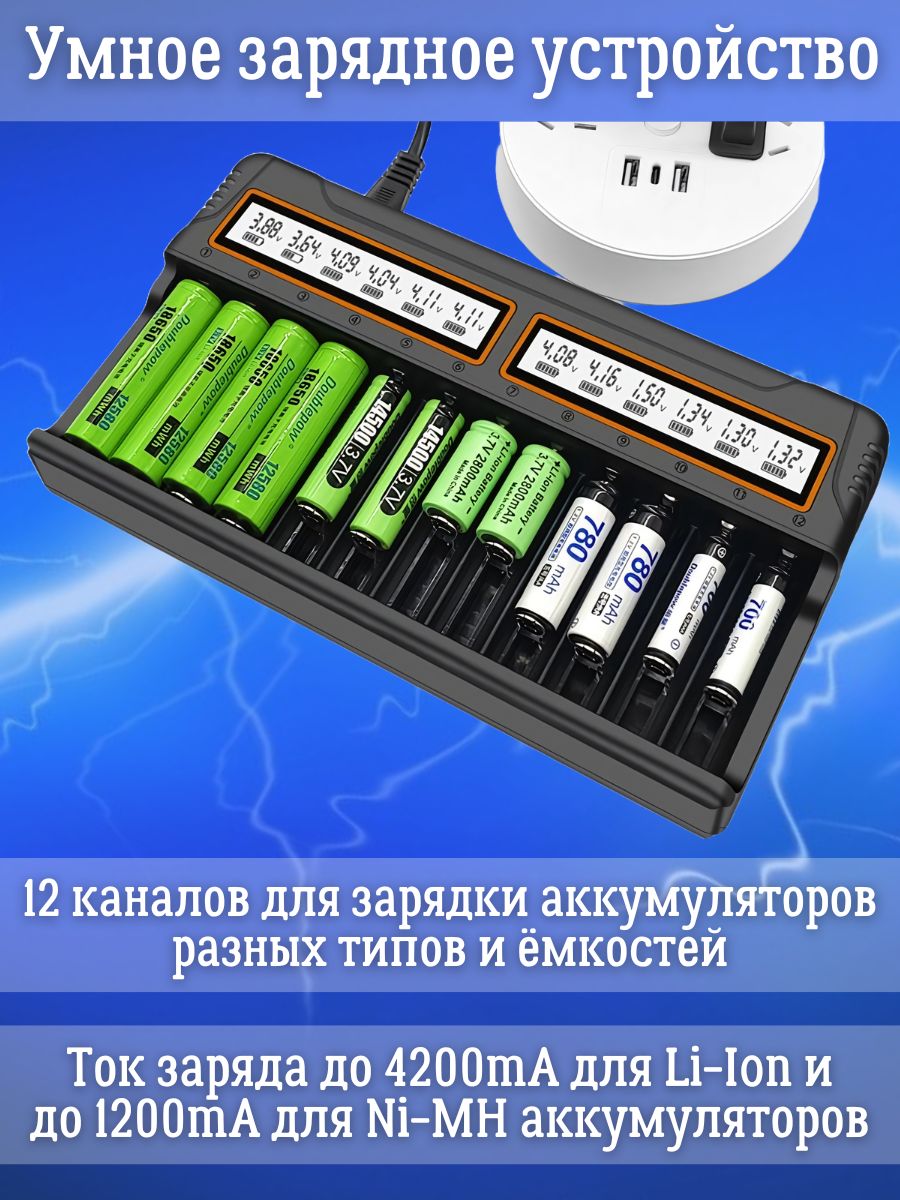 Умное зарядное устройство ANYSMART - мощность и контроль для ваших аккумуляторов! Имеет независимые каналы для одновременного заряда 12-ти аккумуляторов для литий-ионных батарей. LCD-дисплей - отображение напряжения, тока и времени зарядки. Защита: от перезаряда, переполюсовки, короткого замыкания.