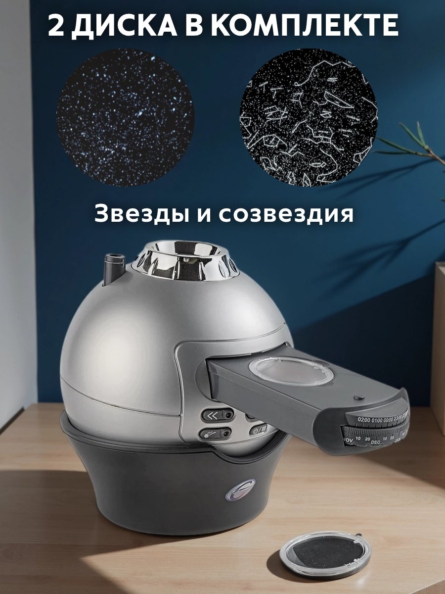 - В комплекте 2 проекционных диска: один создает россыпь из 8000 отдельных звезд для максимально реалистичного вида Млечного Пути, а другой добавляет к ним контуры 61 созвездия с подписями для обучения. Меняйте диски — меняйте атмосферу!